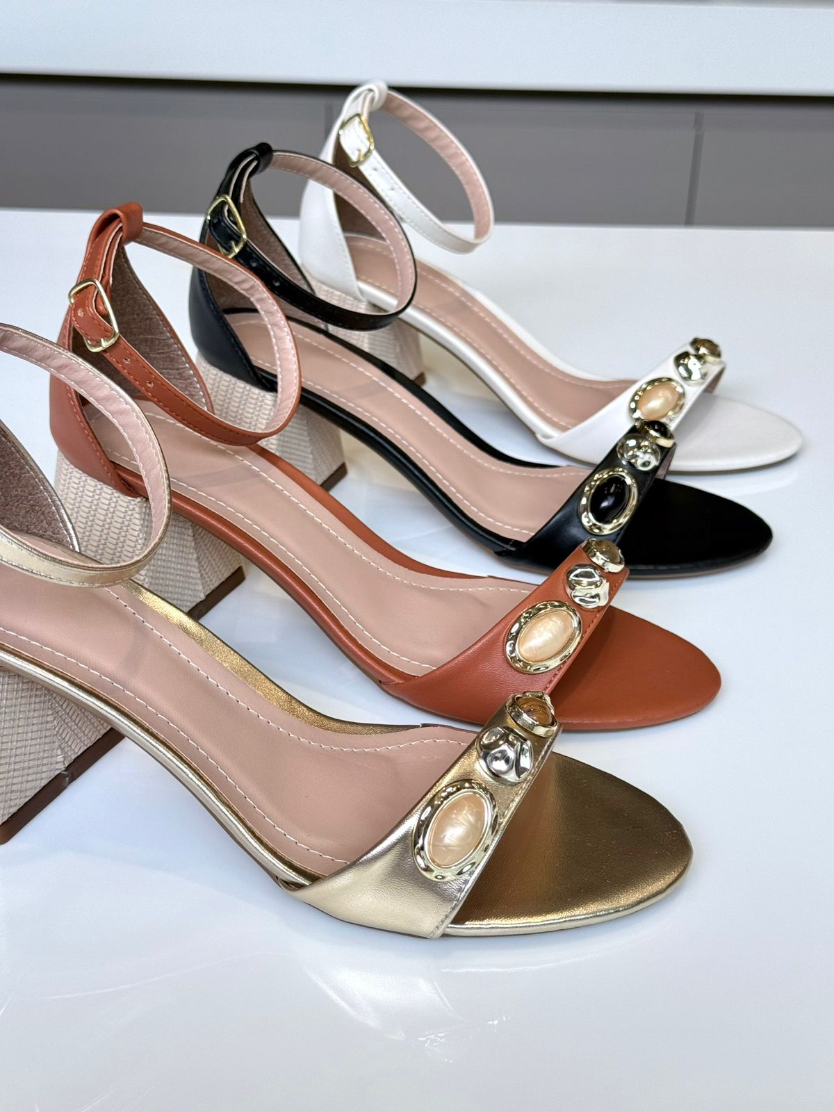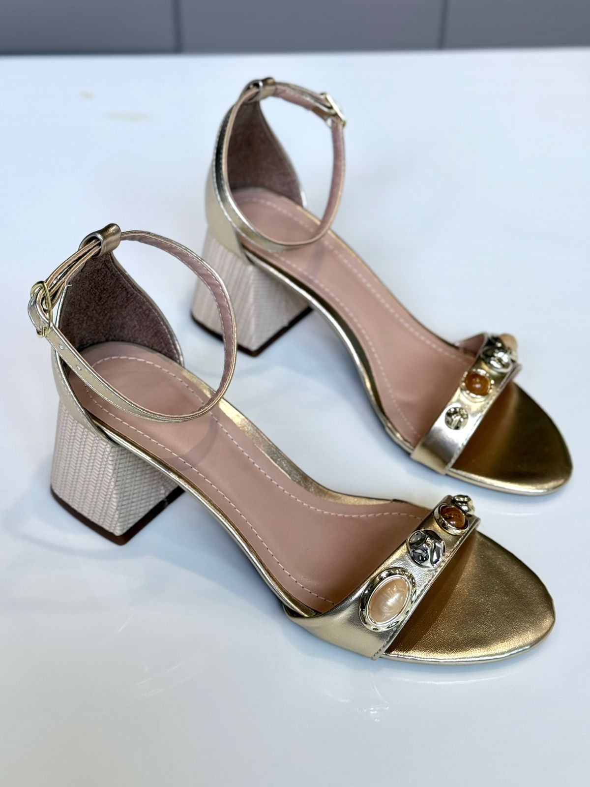 As sandálias possuem salto bloco médio, tiras no tornozelo com fechamento por fivela e detalhes decorativos ovais na parte frontal. É um calçado versátil que combina com diversos looks, do casual ao mais elaborado.